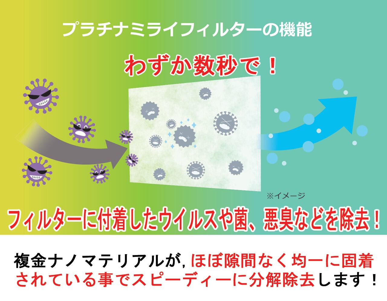ナノプラチナ等の様々な金属ナノ粒子をフィルターの繊維1本1本に均一に固着させている事でスピーディーに効果を発揮します。